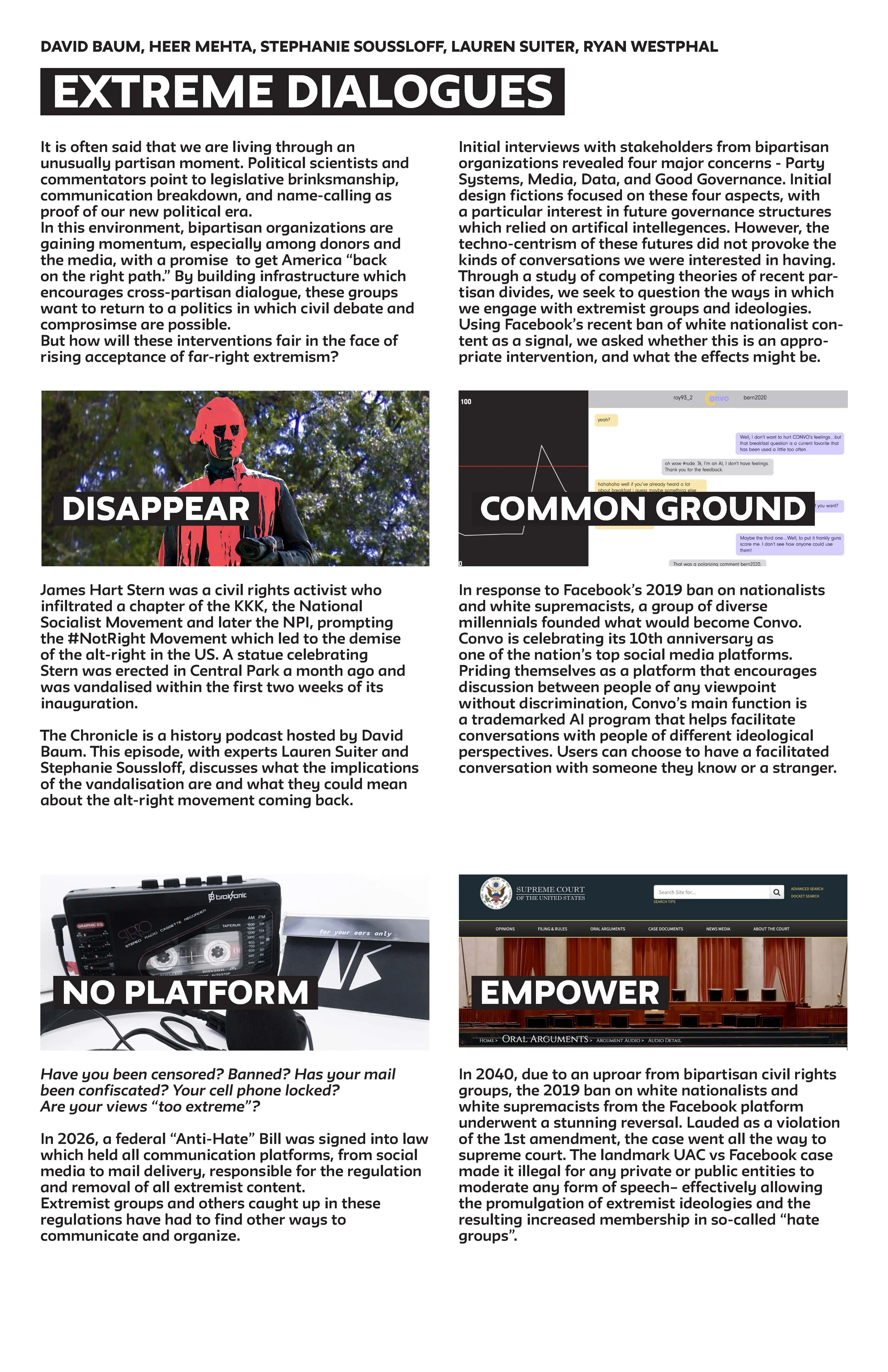How can speculative design principles be instrumentalized to impact conversations about futures for governments and systems of governance? In the Speculative Design studio final, we engaged with this question. Our group chose to focus on how bipartisan organizations are engaging (or not) with extremist groups. Following research and engagement with outside organizations we created alternative futures displayed through four fictional scenarios and designed artifacts.